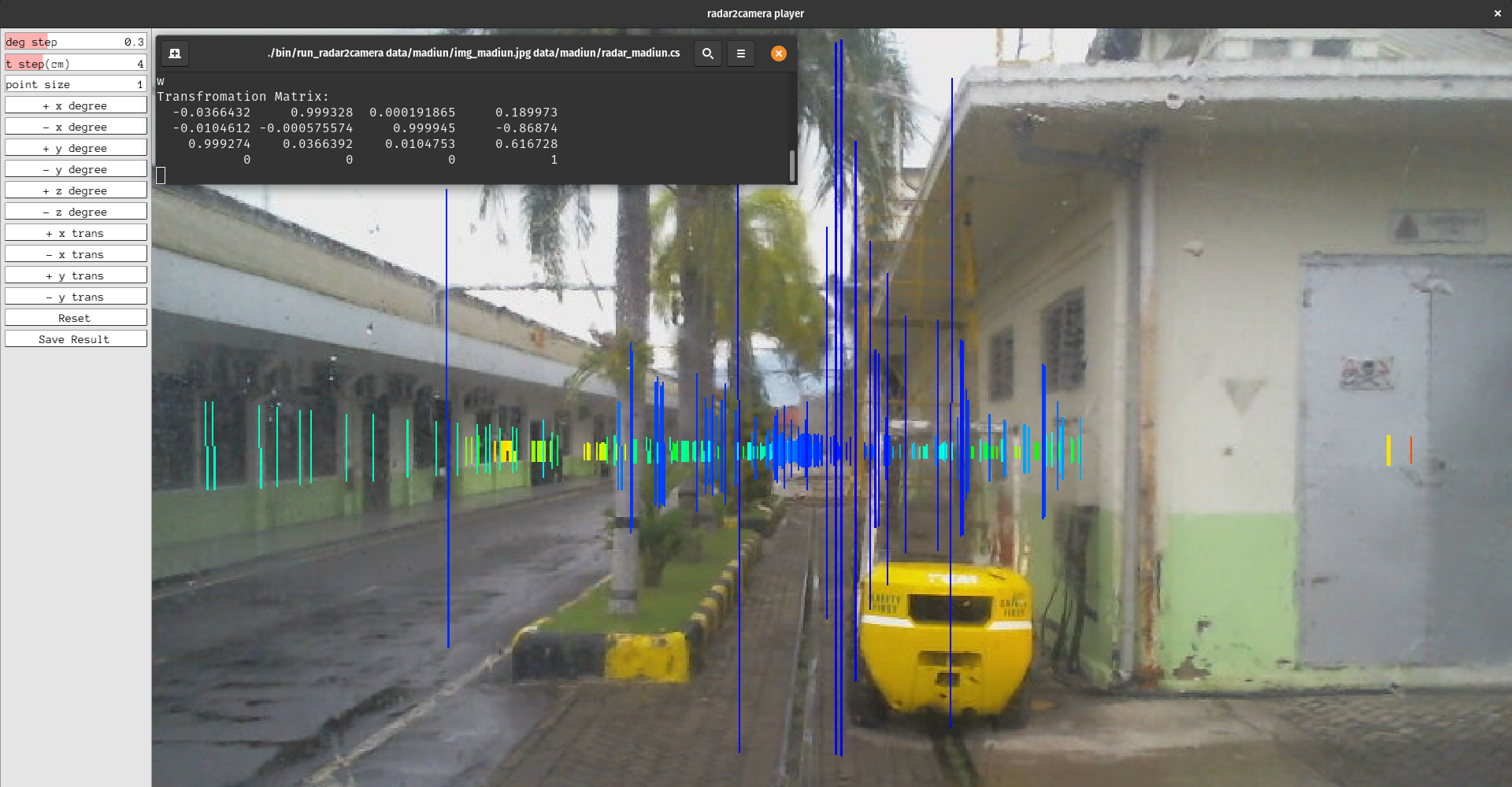 Due to the sparse nature of radar point clouds, the accuracy of the current state-of-the-art radar 3D object detection methods is very poor compared to methods that utilize other sensors like cameras or lidars. Thus, radar is often used to support or complement other sensors instead of being used as a standalone sensor. In this project, the radar is paired with a Sekonix SF3325 RGB camera. As radar-camera automatic extrinsic calibration methods are not too well studied and often require a lidar and a custom-made marker, we opted to use a manual calibration method instead. I adapted OpenCalib to our use case, converting the point clouds into clouds of fixed-size pillars to make the calibration process easier and fixed several transformation equations. The radar-camera extrinsic calibration process using our custom software is illustrated below.