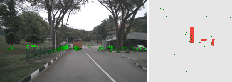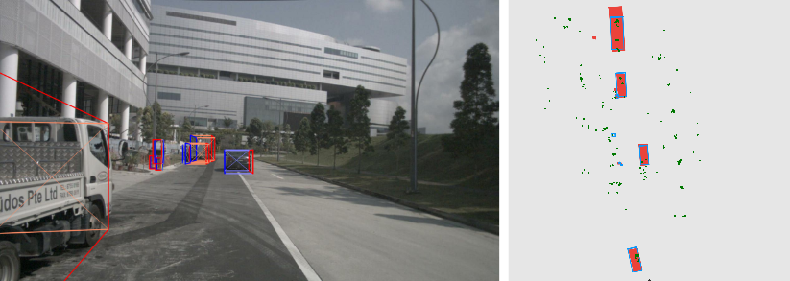 A monocular camera image and a projected radar point cloud (left); the same point cloud viewed from above and ground truth object bounding boxes (right). It is easier to approximate the objects' shape from the point cloud in the top view than in the image perspective view