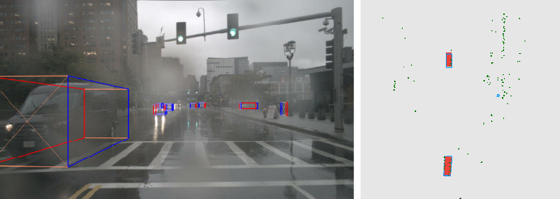 A monocular camera image and a projected radar point cloud (left); the same point cloud viewed from above and ground truth object bounding boxes (right). It is easier to approximate the objects' shape from the point cloud in the top view than in the image perspective view