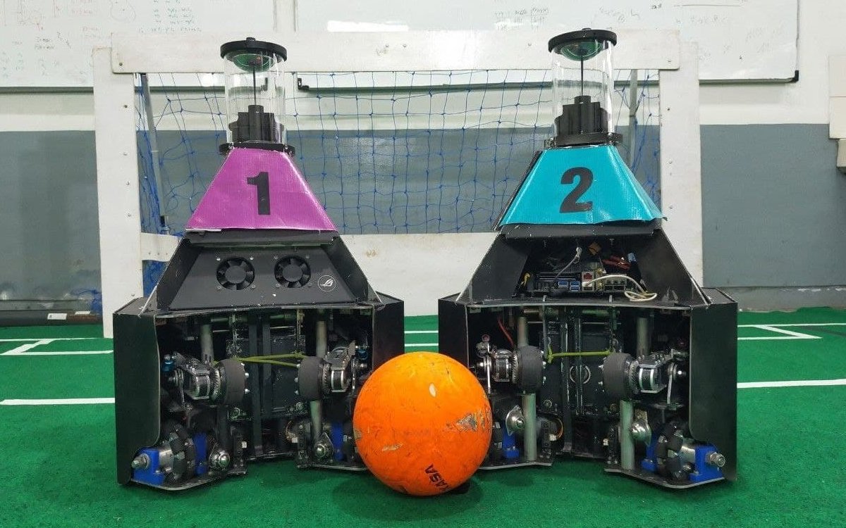 The robots use the A* algorithm to generate path plans. From the path plans, they generate velocity setpoints using a trapezoidal velocity profile, which are then tracked using PID controllers. The robots can kick a soccer ball through the use of a solenoid-based kicking mechanism. The kicking mechanism can deliver both a lob shot and a flat shot. They can also actively control a ball thanks to their dribbling mechanism.